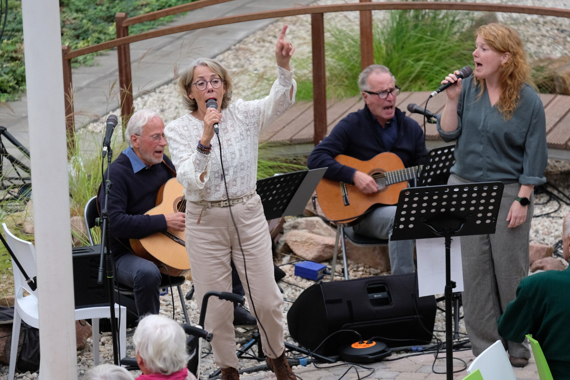 Na een hartelijke ontvangst toog het gezelschap verder richting Arnhem, waar ze na de lunch aan de cliënten van ZZG De Twickelstraat in de huiskamer een uurtje muziek uitdeelde. Ook hier waren de bewoners blij met de liedjes die uit volle borst werden meegezongen en waarbij zelfs werd gedanst met de zangers. Wat heeft iedereen in de lockdown-tijd de muziek en verbinding gemist!